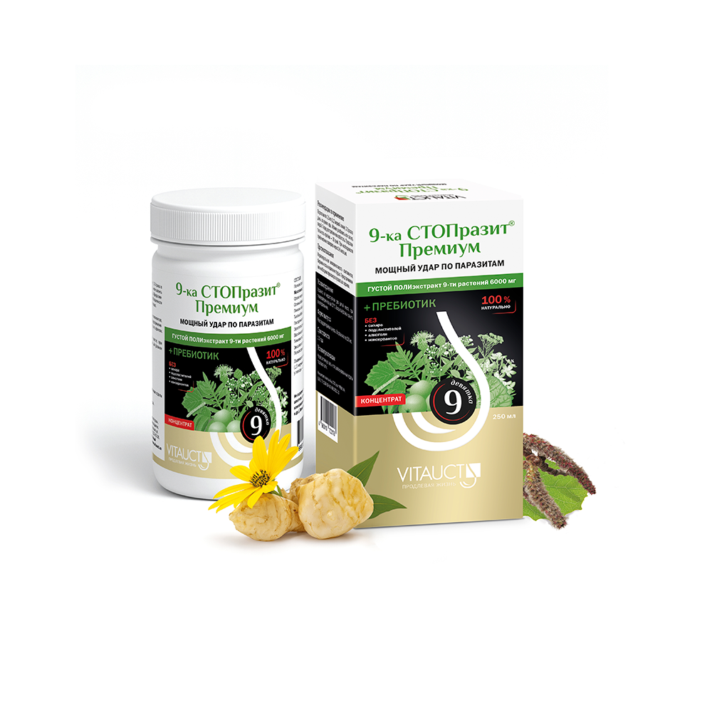 9-ка СТОПразит от компании VITAUCT - это уникальный современный фитотерапийный препарат из 9-ти трав, направленный сразу на более чем 100 видов паразитов, их личинок и яиц. Кроме антипаразитарных свойств, он подавляет патогенную бактериальную и грибковую микрофлору. Является улучшенным вариантом знаменитой американской Тройчатки. Аналогов с таким широким противопаразитарным действием просто нет.
